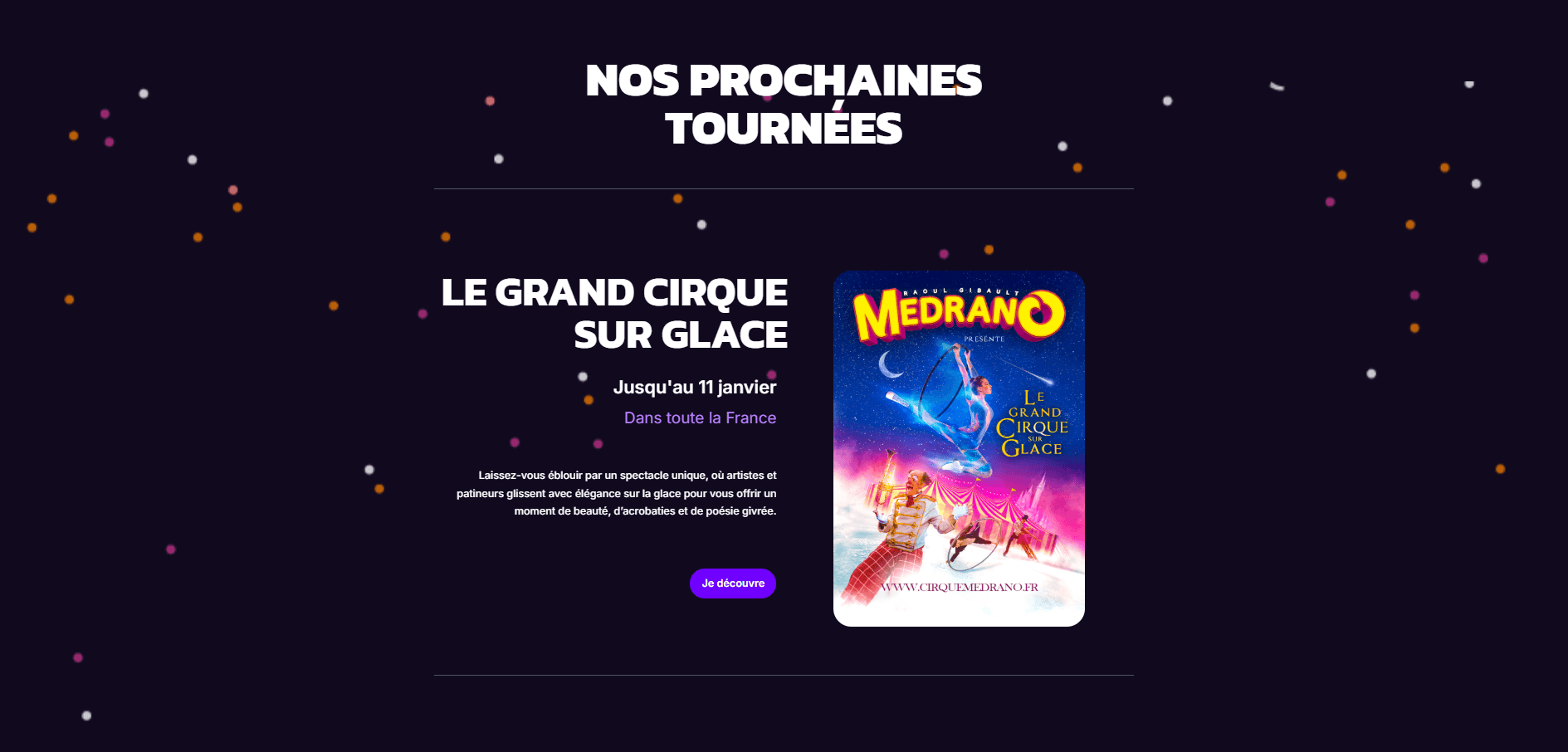 Cirque itinérant français qui propose des spectacles de piste avec acrobaties, numéros sur glace, performances aériennes et animations pour toute la famille en tournée dans plusieurs villes de France.